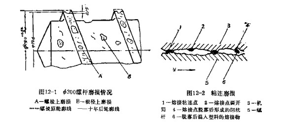 螺杆和机筒表面光洁度都在▽7以上,从外表看它是很光滑的。实际上它们都有1.25微米足有的表面粗糙度。由于撞击,变形的影响,用显微镜可以观察到表面粗糙度还要大一些。这就造成了点接触的条件。在高温和高压作用下,这些接触点产生很高的局部应力,并且相互粘连熔接在一起。由于螺杆和机筒的相对运动,这些溶解点脱落下来混入塑料中去,并在螺杆和机筒的表面形成凹坑和凸起,凸起点相互接触更进一步的加快了粘连磨损(图12-2)。
